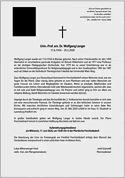 Wolfgang Langer war über 40 Jahre[4] in der Pfarre Perchtoldsdorf als Priester tätig[5] und lebte ab 2019 bis zu seinem Tod im Altenheim der Kreuzschwestern in Laxenburg.[2]