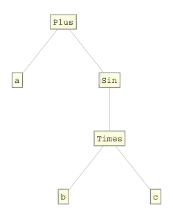 Darstellung des Ausdrucks Plus[a,Sin[Times[b,c]]] als TreeForm