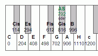 Die Zahlenwerte in der folgenden Tastatur geben den Abstand zu C in Cent an.[3]