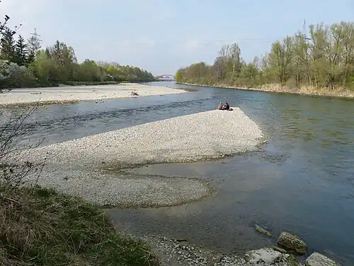 ![]() Der heutige Zusammenfluss von Wertach (links) und Lech (rechts) an der Wolfzahnau | |