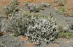 - Eriocephalus namaquensis M.A.N.Müll.[10] Sie wurde 2001 erstbeschrieben.[1] Sie kommt im Nord- sowie Westkap vor.[9] In den Arealen ist sie relativ häufig. Sie ist ein wichtiges Florenelement der westlichen Berg-Karoo und der Sukkulenten-Karoo. Das westliche Teilareal liegt im Winterregengebiet, aber Sommerregen fällt im östlichen Teilareal. Der Jahresniederschlag beträgt weniger als 200 mm und im Verbreitungsgebiet kommen oft Trockenperioden vor.[1] Sie wurde in der Roten Liste der gefährdeten Pflanzenarten Südafrikas ohne erfolgtes Monitoring automatisch als LC = Least Concern = nicht gefährdet eingetragen.[9]