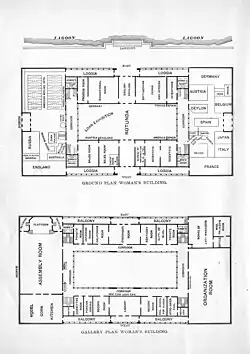 Haydens Entwurf verband griechischen Klassizismus mit italienischer Renaissance. Das Woman’s Building war 118 Meter lang und 61 Meter breit. Das Gebäude wurde mit der Längsseite an einer „Lagune“ errichtet. Es war streng symmetrisch angelegt. Über zwei breite Treppen und eine Terrasse war der Bau vom Wasser aus zu erreichen. An die Haupteingänge im Osten und Westen schlossen sich langgestreckte Loggien an, die an den Seitenpavillons endeten. Die offenen Loggien waren als Arkaden mit schlanken Säulen und Rundbogen ausgeführt. Über ihnen befanden sich jeweils offene Balkone.