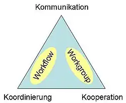 Im Gegensatz dazu sind Workflow-Management Systeme, ebenso Teil der CSCW, mit der Koordination von strukturierten Abläufen beschäftigt, wie bei Geschäftsprozessen z. B. Standardisierte Schadensaufnahme bei Versicherungen.