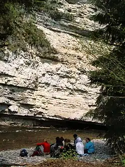 Austritt der unterirdischen Wutach zwischen zwei Felsschichten -
