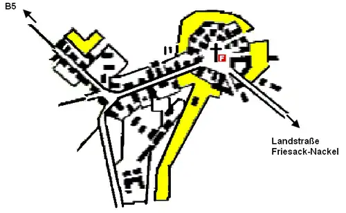 Das Dorf bestand aus 19 Gehöften, sie bilden einen Ring um den runden Dorfplatz in dessen Mitte die Kirche mit Begräbnisplatz und die Schule stand und so sieht das Dorf unverändert über die Jahrhunderte hinweg immer noch aus. Die einzige Zufahrt zum Dorf war ein von Osten herkommender Zuweg von der abseitigen Landstraße zwischen Nackel und Friesack. An die Gehöfte schlossen sich die keilförmigen erweiterten Gärten umschlossen von Hecken als einen natürlichen Schutzwall an. Den Gärten folgten dann die Äcker auf den noch bis in die Mitte des 19. Jahrhunderts ein dichter Bestand an alten Eichen, Birken, Eschen zu finden war.