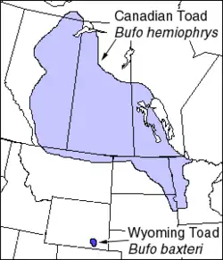 Verbreitungsgebiete der Kanadischen Kröte (Anaxyrus hemiophrys) und der Wyomingkröte (Anaxyrus baxteri), beide hier noch in der Gattung Bufo.