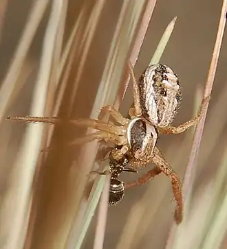 Der Hinterkörper (Opisthosoma) zeigt wie viele Arten der Gattung auf hellbeigem oder weißlichem Grund eine dunkle Blattzeichnung. Diese ist beigebraun, dunkel gerandet, innen nur schwach eingebuchtet und durch die helle Grundfärbung in zwei Längsbänder getrennt. Die Beine zeigen über die gesamte Länge dieselbe Grundfarbe wie der Spitzfleck auf dem Prosoma und sind nur schwach dunkel gefleckt.
