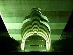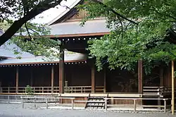 Links vom Shimmon befinden sich der Saikan (斎館) zur rituellen Reinigung der Priester und das Schreinamt (社務所, shamusho). Direkt rechts vom Shimmon befindet sich ein Taubenverschlag für weiße Tauben (白鳩鳩舎, shirohato kyūsha), der die 300 weißen Tauben des Schreins beherbergt,[19] und eine Nō-Theater-Bühne (能楽堂, nōgakudō). Die Bühne wurde 1881 im Shiba-Park errichtet und 1903 in den Schrein umverlegt.[20] Die Bühne liegt auch links am Anfang eines vom Nordtor (北門, kita-mon) ausgehenden Wegs, während sich rechts das Museum Yūshūkan (遊就館) befindet.