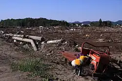 Der Tsunami zerstörte nicht nur den Küstendeich, sondern entwurzelte auch alle Bäume und riss sie landwärts mit sich.[3][4] Die Kiefern des Küstenwaldes wurden durch den Tsunami weitgehend zerstört, indem sie umgekippten und ihre Stämme sehr nahe am Boden umgebrochen wurden. Der Küstenwald erzeugte in der Folge erhebliche Mengen an Trümmern. Es konnte gezeigt werden, dass solche Trümmer strukturelle Schäden an einem 1 km landeinwärts gelegenen Stahlrahmen-Landwirtschaftsgebäude verursachten, das nicht nur seine Verkleidung bis in 4 m Höhe verlor, sondern beim Vordringen des Tsunamis auch von einem Baumstamm getroffen wurde, der tragende Elemente verbog.[1]