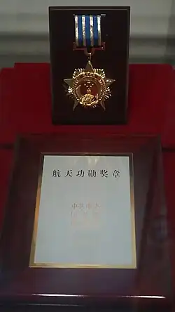 Drei Wochen später, am 7. November 2003, wurde ihm der neugeschaffene staatliche Raumfahrtverdienstorden (航天功勋奖章) verliehen. Gleichzeitig erhielt er den Ehrentitel „Held der Raumfahrt“ (航天英雄),[14] den Stand 2021 nur zwei chinesische Raumfahrer tragen (der zweite ist Zhai Zhigang). Der Raumfahrtverdienstorden wurde hingegen später – in verschiedenen Stufen – allen aktiven Raumfahrerinnen und Raumfahrern Chinas verliehen.[15]