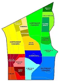 - Southeast Yonkers (südöstliches Yonkers): Southeast Yonkers ist eine vor allem von italienisch- oder irischstämmigen Amerikanern bewohnte Gegend, eine typische Ostküsten-Arbeiterklasseinnenstadt, mit einer hohen Anzahl Katholiken. Der größte Teil der Architektur und der Geschäfte in Southeast Yonkers ähneln eher Gegenden der Bronx, Brooklyns, Queens oder Staten Islands. Dies liegt wohl vor allem an der Nähe zur Bronx. Viele betrachten einen Teil der Midland Avenue, die vor allem von Iren bewohnt wird und fließend in die Bronx übergeht, als den „wahren Kern“ von Yonkers. Eine andere Sektion der Midland Avenue, die Dunwoodie-Gegend, wird auch als „Little Italy of Yonkers“ bezeichnet. Die bekanntesten Gebäude und Orte in Southeast Yonkers sind das Cross Country Shopping Center, der Yonkers Raceway und das St. Joseph’s Seminary and College.