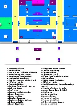 Im Tempel befinden sich zudem Abbilder von Guanyin (Göttin der Barmherzigkeit), Tai Sui (Sechzig Götter der Zeit),[2] Tin Hau,[6] dem alten Mann unter dem Mond (Gott der Heiratsvermittlung und Heirat) und Tu Di Gong (Erdgott).[7]