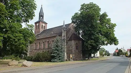 Bereits für das Jahr 1339 ist für den Ort eine eigene Kirche urkundlich nachgewiesen. Ein Fachwerkbau brannte 1637 im Dreißigjährigen Krieg ab. Nach dem Krieg wurde im Jahre 1670 erneut eine Kirche errichtet. Dieser Fachwerkbau fiel im Jahre 1855 einem Feuer zum Opfer. Schon zwei Jahre folgte auf dem Dorfanger die Errichtung eines Nachfolgebaus. Bei dem heute zu sehenden Bauwerk, handelt es sich um eine im neugotischen Stil errichtete Kirche aus Feldsteinen, die im Jahre 1857 eingeweiht werden konnte. Für die Entwürfe zeichnete der damalige Torgauer Bauinspector Dolscius verantwortlich. Die Kirche ist heute im örtlichen Denkmalverzeichnis eingetragen.[4][5][6]