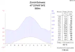 Die Jahresmitteltemperatur an der Messstation der MeteoSchweiz in Zürich (auf 556 m ü. M. am Hang des Zürichbergs und damit 150 m über dem Niveau des Stadtzentrums gelegen) beträgt 8,5 °C, wobei im Januar mit −0,5 °C die kältesten und im Juli mit 17,6 °C die wärmsten Monatsmitteltemperaturen gemessen werden. Im Mittel sind hier 88 Frosttage und 26 Eistage zu erwarten. Sommertage gibt es im Jahresmittel 30, während normalerweise drei Hitzetage zu verzeichnen sind. Diese Werte sind relativ niedrig im Vergleich zu anderen Mittellandstationen, was sich aufgrund der Höhenlage der Station erklären lässt. Im Limmattal sind im Jahresmittel deutlich mehr Sommertage und Hitzetage zu erwarten. Die Messstation Zürich weist im Mittel 1482 Sonnenstunden pro Jahr auf. Die 1136 mm Niederschlag fallen über das ganze Jahr verteilt, wobei im Sommerhalbjahr und speziell während der drei Sommermonate aufgrund der konvektiven Niederschläge höhere Mengen gemessen werden als im Winter.