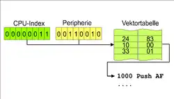 - Die CPU unterbricht das laufende Programm, liest die Adresse, holt sich aus der Interruptvektor-Tabelle die Adresse des zugehörigen Programmcodes ISR und führt diesen aus. Nach Abarbeitung der Interrupt-Service-Routine führt die CPU das unterbrochene Programm fort.