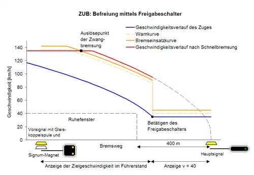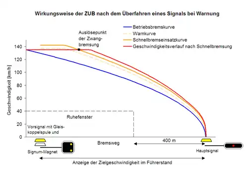 Aus diesen Angaben berechnet das Fahrzeuggerät eine präzise Bremskurve.[6] Wenn nach der Vorbeifahrt an einem Warnung zeigendem Vorsignal der Triebfahrzeugführer den Zug beschleunigt, wird er durch einen akustischen und optischen Alarm gewarnt, ausser der Zug fährt langsamer als 40 km/h und ist noch weiter als 400 Meter vom Hauptsignal entfernt (sogenanntes Ruhefenster).