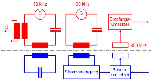 Mit 50 kHz wurde der Überwachungskanal abgefragt, die Energieübertragung erfolgte mit 100 kHz. Die Daten wurden mit 850 kHz übertragen.