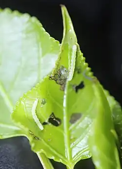 Die Raupen fressen in der Regel die Äste von oben nach unten ab. Die Verpuppung findet an der Basis der Pflanzen zwischen Blättern oder direkt am Boden statt.[1] Die Puppe ist schwarz.