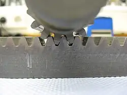Die Form der Stangenzähne entspricht der Abwicklung der Radzähne. Bei einer Zahnstange ist die Teilung t gut erkennbar: gerader Abstand von einem Zahn zum nächsten Zahn.