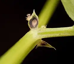 Die Nebenblätter sind viel kleiner als die Fiederblättchen, eiförmig bis halbpfeilförmig, mehr oder weniger gezähnt und unterseits mit je einem konkaven, purpur-braunen Fleck (Nektarium) versehen.