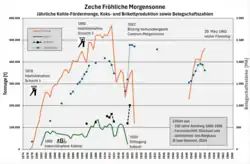 1928 wurde der Neubau des Kesselhauses auf der Zeche Fröhliche Morgensonne fertiggestellt.[17] Als Nebenanlagen werden für 1928 genannt: Kokerei mit insges. 203 Koksöfen, Benzolfabrik, Ammoniakfabrik, Teerdestillation, zwei Brikettfabriken, zwei Ziegeleien und Schmiermittelfabrik.[18]