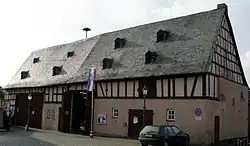 Der langgezogene Fachwerkbau, der die gesamte Westseite des Schlossplatzes abschließt, entstand durch eine Verdoppelung der Zehntscheune im späten 19. Jahrhundert.
