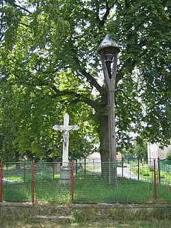 - Sandsteinkreuz und hölzerner Glockenbaum auf den Dorfplatz