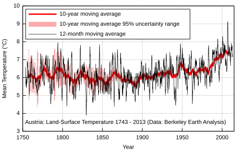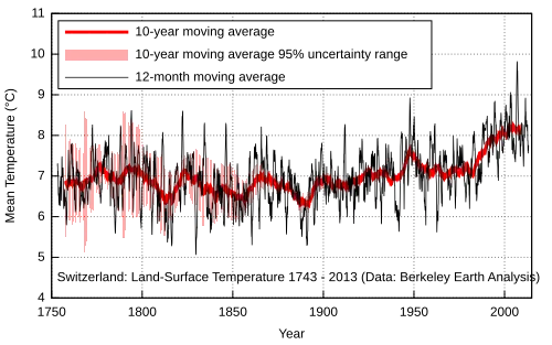 Die Änderung der Messhöhe für die Temperatur hat ebenfalls einen geringen Einfluss auf die Mittelwerte. Am Anfang des Untersuchungsintervalles bis teilweise in die 1920er Jahre wurde die Temperatur nicht einheitlich auf zwei Meter Höhe über Grund gemessen, sondern teilweise auf zehn oder mehr Metern. Dies hatte zur Folge, dass die Mittelwerte im Winter geringfügig höher ausfielen, bedingt durch die Ansammlung von Kaltluft in Bodensenken in klaren Nächten. Dieser Effekt dürfte auf die Temperaturreihe aber nur einen sehr geringen Einfluss haben.[40]