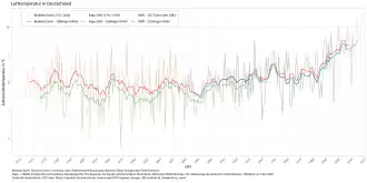 - ↑ Deutscher Wetterdienst, Climate Data Center: Gebietsmittelwerte der Temperatur für Deutschland.