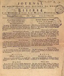 Nachdem die vormals souveräne Hansestadt Bremen am 1. Januar 1811 zwangsweise ins Kaiserreich Frankreich eingegliedert und Hauptstadt des neugeschaffenen französischen Départements des Bouches du Weser geworden war, erging am 1. Februar 1812 die Verordnung, dass fortan im gesamten Departement nur noch eine einzige Zeitung erscheinen durfte, die Artikel politischen Inhalts veröffentlichte. Bereits am folgenden Tag erschien die erste Ausgabe der neuen Zeitung des Departements der Weser-Mündungen, einer zweisprachigen Zeitung, die das offizielle Sprachrohr der französischen Obrigkeit darstellte. In der ersten Ausgabe wurde bekanntgemacht, dass jegliche andere Form des Zusammentragens und Publizierens von Nachrichten und Informationen fortan verboten war. Als Folge musste die erste Bremer Zeitung, die seit 1741 gedruckt wurde, ihr Erscheinen einstellen.