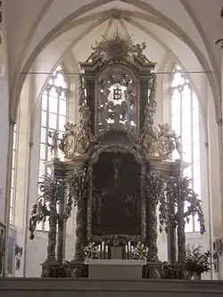 Die große Altarschauwand aus Holz stammt von 1671 und ist ein Werk von Johann Caspar Sandmann. Das Altarblatt zeigt eine Kreuzigung von Christian Schäfer, über dem sich ein Jesusmonogramm in geschnitztem Wolkenrahmen befindet. Seitlich sind die Initialen von Herzog Moritz und seiner zweiten Frau als Stifter des Werks zu sehen.[4]
