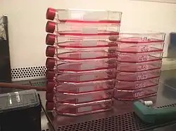Im Jahr 1948 isolierten Wilton R. Earle und Kollegen einzelne Zellen der L-Zelllinie und zeigten, dass sie in der Gewebekultur Klone von Zellen bilden.[31][41] John Franklin Enders, Thomas Huckle Weller und Frederick Chapman Robbins zeigten 1949 erstmals die Kultur von Polioviren in Nierenzellen von Affen, wodurch Polioviren für die Erzeugung von Polioimpfstoffen gewonnen werden konnten (der Impfstoff nach Jonas Salk ab 1952).[42] Sie erhielten 1954 der Nobelpreis für Physiologie oder Medizin „für ihre Entdeckung der Fähigkeit des Poliomyelitisvirus in Kulturen von verschiedenen Gewebsarten zu wachsen“.[43] George Otto Gey und Kollegen etablieren 1952 eine kontinuierliche unsterbliche Zelllinie, die aus einem Cervixkarzinom stammt und noch heute unter der Bezeichnung HeLa-Zellen verwendet wird.[31][44] Rita Levi-Montalcini und Mitarbeiter zeigten 1954, dass der Nervenwachstumsfaktor (NGF) das Wachstum von Axonen in Gewebekulturen stimuliert.[31][45] Im Jahr 1955 führte Harry Eagle die erste systematische Untersuchung der essenziellen Ernährungsbedürfnisse von Zellen in Kultur durch und stellte fest, dass sich tierische Zellen in einer definierten Mischung aus kleinen Molekülen, ergänzt durch einen geringen Anteil an Serumproteinen, vermehren können.[31][46] Theodore T. Puck und Mitarbeiter selektieren 1956 Mutanten mit veränderten Wachstumsanforderungen aus Kulturen von HeLa-Zellen.[31][47] Im Jahr 1958 entwickelten Howard Temin und Harry Rubin einen quantitativen Test für die Infektion von Kükenzellen in Kultur durch das gereinigte Rous-Sarkom-Virus.[31][48] Im folgenden Jahrzehnt wurden die Merkmale dieser und anderer Arten von viraler Transformation von Michael Stoker, Renato Dulbecco, Maurice Green und anderen Virologen bestimmt.[31]