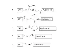 Zellpenetrierende Peptide können über verschiedene Bindungen an Nukleinsäuren gekoppelt werden, darunter mit spaltbaren Linkern, z. B. mit Disulfidbrücken,[47] Amiden, Thiazolidin, Oximen und Hydrazinen.[48] Allerdings wirken sich diese Gruppen vermutlich auf die biologische Aktivität aus.[49] Daher werden auch nichtkovalente Methoden der Verbindung zwischen CPP und Nukleinsäuren verwendet.[50][51] Bei siRNA wurden kovalente[52][53] und nichtkovalente Methoden verwendet.[54] Ebenso wurden CPP mit kompetitiv hemmender DNA,[55][56][57] Plasmiden,[58][59] Proteinen[60][61][62] Kontrastmitteln,[63][64][65] Quantenpunkten,[66][67][68][69][70][71] Gadolinium-Komplexen und superparamagnetischem Eisenoxid (SPIO) eingesetzt.[72][73][74][75]