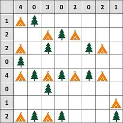 Zeltlager ist ein logisches Rätsel oder Ratespiel, das in vielen Abwandlungen und unter verschiedenen Namen populär ist.