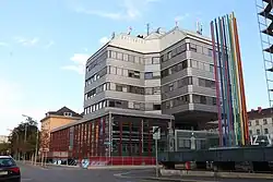 Die oberen Geschoße des strukturalistischen[1] Baus zweigen in vier um 90° versetzten Flügeln von einem zentralen Kern ab und sind am Dachgeschoß hängend gelagert, wodurch ein schwebender Eindruck entsteht.[2]