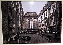 Die Neueröffnung der Löwener Universitätsbibliothek 1928 gelang insbesondere mit amerikanischen Geldern. Der amerikanische Architekt Warren wollte ursprünglich die Inschrift Furore teutonico diruta, dono americano restituta (Durch deutsches Wüten zerstört, mit amerikanischer Hilfe wieder aufgebaut) anbringen, der Rektor der Universität entschied sich aber mit Rücksicht auf die Aussöhnung mit Deutschland dagegen. Der Streit darum schlug aber Wellen und Pressemitteilungen und Gerüchte dazu sollen auch ein Grund gewesen sein, dass die Bibliothek im Mai 1940 bei der deutschen Besetzung von Löwen während des Westfeldzugs ein zweites Mal in Flammen aufging mit fast einer Million Büchern.[12] Am 16. Mai 1940 wurde die neu aufgebaute Löwener Bibliothek von der Wehrmacht mit Artillerie beschossen und getroffen.[13] Die NS-Propaganda verbreitete, die Bibliothek sei von den Engländern in Brand gesetzt worden; NS-Propagandaminister Joseph Goebbels besichtigte die Ruine.[14]