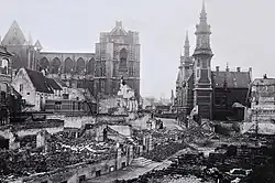 Nachdem die deutschen Truppen an zahlreichen Stellen der Stadt Feuer gelegt hatten, legten sie am 25. August um halb zwölf auch Feuer im Keller der Universitätsbibliothek.[3] Das Gebäude brannte in der Nacht vom 25. auf den 26. August nieder. Dabei gingen 1000 mittelalterliche Handschriften, 800 Inkunabeln und 300.000 Bücher verloren. Nur das gotische Rathaus von Löwen blieb verschont, es diente als Hauptquartier und Unterkunft für deutsche Offiziere.[4]