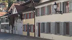 Die zweigeschossige Gebäudezeile lehnt sich mit ihrer Rückseite an den erhalten gebliebenen Rest der Schiedmauer an[1]. Diese wurde nach dem Rorschacher Vertrag von 1566 errichtet und schloss den gesamten Bereich der Fürstabtei St. Gallen von der Stadt ab.
