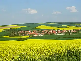 Blick auf Rhoden und das Quellgebiet des Zieselbachs sowie seinen Verlauf im Tal zwischen Großem und Kleinem Fallstein. | ||