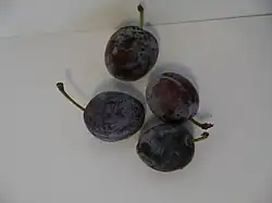 Die Frucht hat einen Durchmesser von 2 bis 3 (selten ab 1) Zentimeter. Sie ist kugelig und blau, schwarz, blaurot, grüngelb oder gelb gefärbt, mit rötlichen Wangen. Der Steinkern ist rundlich-eiförmig und runzelig, seine Dicke entspricht 73 bis 79 % der Länge. Die Kammfurche weist nur bei ostalpinen Sorten schräge Kammstriche auf. Der Kern löst sich bei Reife oder Überreife nur manchmal vom Fruchtfleisch.[5]