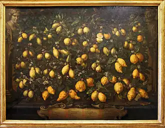 Wohlhabende italienische Familien verfügten bereits im 16. Jahrhundert und damit in der Renaissance über spezielle Sammlungen von Zitruspflanzen, in denen vergleichbar einem Kuriositätenkabinett auch ausgefallenere Sorten und Mutationen gepflegt wurden.[15] Als besonders herausragend galt die Sammlung der Familie Medici, die auf das Jahr 1537 zurückgeht, dem Jahr, in dem Cosimo I. de’ Medici an die Macht kam und damit begann, den Landsitz der Familie, Villa Medici von Castello, umzubauen.[16] Der mit der Gartengestaltung beauftragte Niccolò Tribolo nutzte Zitruspflanzen, die die goldenen Äpfel der Hesperiden aus der antiken Heraklessage symbolisierten, um eine Verbindung zwischen der Medici-Familie und den heroischen Tugenden von Herakles zu unterstreichen.[15] Zunächst wurden im Garten der Villa nur Zitruspflanzen gepflegt, die auf Sizilien und im Süden Italiens regelmäßig angebaut wurden, aber bereits unter Francesco I. de’ Medici wurden auch zunehmend ausgefallenere Sorten gepflegt.[15] Der französische Naturforscher Pierre Belon, der im Zeitraum zwischen 1546 und 1549 den Garten besuchte, beschreibt ihn als einen Garten, der wie ein Teppich mit Orangen und Zitronenpflanzen bestückt sei.[15] Winterlichen Schutz fanden die empfindlichen Zitruspflanzen im Norden der Toskana im sogenannten limonaia (wörtlich übersetzt: Zitronenhaus), der italienischen Abwandlung der Orangerie.[17] Der italienische Renaissancegarten fand zwar in Frankreich, Deutschland und England Nachahmer, allerdings zunächst mehr in seinen gestalterischen Elementen als mit seinen Bepflanzungen.
