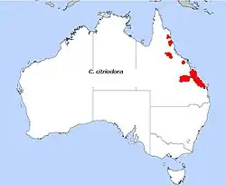 Das Hauptverbreitungsgebiet des Zitroneneukalyptus ist die Ostküste Australiens, vom nordöstlichen New South Wales nördlich von Coffs Harbour bis zum nördlichen Queensland nördlich von Cooktown sowie die westlich anschließende Great Dividing Range. Auch an der Küste des südlichen New South Wales um und südlich von Sydney sowie im nördlichen Victoria und um Adelaide in South Australia findet man vereinzelt Corymbia citriodora.[1][3][4]