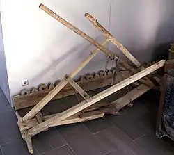 Dieser Schwingpflug besitzt eine zweiteilige Pflugschar, welche an den zwei Armen eines in der Mitte gespaltenen Hakenbrettes steht.[1] Er besitzt einen langen Grindel und zwei hinten an demselben angebrachte, etwas schräg stehende, oben mit Querhandhaben versehene Sterzen (Handgriffe). Der Pflugbaum hat sich quasi in eine Gabeldeichsel ausgebildet.[2]