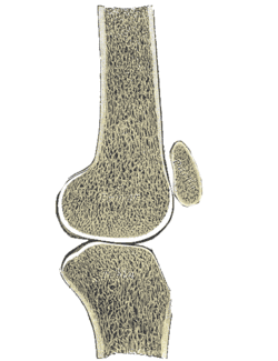 Über den auf dem Femur dargestellten, kranialen Knorpelbereich gleitet die Patella bei der aktiven Streckung des Kniegelenkes