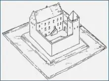 1600 wurde der Komplex mit einem Wassergraben, einem bewehrten Tor und zwei dazugehörigen Tortürmen beschrieben; im Kernbereich stand eine Wasserburg mit vier Rundtürmen.