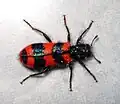Die Flügeldecken sind deutlich, aber feiner als der Halsschild punktiert (Abb. 6 A). Die Punkte stehen teilweise reihig, teilweise unregelmäßig. Die Flügeldecken sind an der Basis deutlich breiter als der Halsschild. Seitlich verlaufen sie annähernd parallel, nach hinten verbreitern sie sich wenig, bevor sie gemeinsam halbkreisförmig enden. Die Flügeldecken sind rot mit drei schwarzen Dorsalbinden, deren vorderste schräg nach vorn außen gestellt ist. Die hinterste dorsale Binde erreicht den Nahtwinkel nicht, ebenso nicht den seitlichen Flügelrand (Abb. 7). Die Flügeldeckennaht ist bis zur hinteren Binde schwarz, an der Basis ist die schwarze Färbung zu einem breiten dreieckigen bis quadratischen Flecken erweitert, der das Schildchen einschließt. Die Form und Ausdehnung der schwarzen Färbung variiert, Mulsant beschreibt mehrere Varianten.[15]