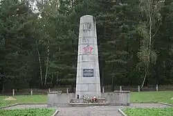 - In der Mitte des Friedhofs ist eine Stele aufgestellt. In 36 Massengräbern sind insgesamt 8500 sowjetische Kriegsgefangene begraben.[6]