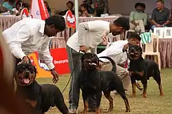 Zuchtrichter erkennen am Aussehen des Hundes alle sichtbaren Erbfehler, zu denen auch Entropium, Ektropium, erblicher Augenausfluss, fehlende Zähne, Zahnfehlstellungen und Kieferanomalien gehören sowie sonstige sichtbare Missbildungen wie z. B. Brachycephalie. Das Gangwerk[57] des Hundes zeigt seine Fähigkeit zu einer harmonischen Bewegungskoordination und erlaubt Rückschlüsse auf den Zustand der Muskulatur, des Knochensystems und der Gelenke.[58][59][60] Der Tierarzt kann durch manuelle Untersuchungen der Kniescheiben eine Patellaluxation ausschließen bzw. den Grad der Beweglichkeit der Kniescheibe feststellen. Bei manchen Rassen, in denen Patella-Luxation vorkommt, dürfen zur Zucht zugelassene Hunde mit Grad 1 oder 2 von einem PL-freien (Grad 0) Partner angepaart werden. Bei anderen Rassen ist die Zucht mit Hunden die Patella-Luxation aufweisen generell verboten.[61][62]