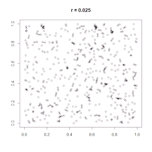 Für und wird ein zufälliger geometrischer Graph generiert, indem Knoten gleichverteilt auf gezogen werden. Alle Knoten, deren euklidischer Abstand kleiner als ist, werden durch eine Kante verbunden. Hierbei werden keine Schleifen betrachtet, da sonst jeder Knoten eine Schleife hätte. Damit charakterisieren die Parameter und einen zufälligen geometrischen Graph.