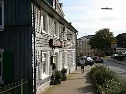 Das eher niedrige und heute allseitig verschieferte, traufständige Fachwerkhaus besitzt eineinhalb Geschosse, wobei das Dachgeschoss als Wohnung genutzt wird. Rückseitig angebaut wurde etliche Jahre später ein eingeschossiger Anbau ebenfalls mit nach außen hin verschieferter Fachwerkkonstruktion, der sich aufgrund der Hanglage über einem mannshoch aufragenden Kellergeschoss erhebt, giebelständig hin zur Straße „Am Stadtbahnhof“ ausgerichtet ist und einen kleineren Saal beherbergt. Im Erdgeschoss des offenbar seit der Erbauung gastronomisch genutzten Gebäudes befindet sich heute ein italienisches Restaurant.